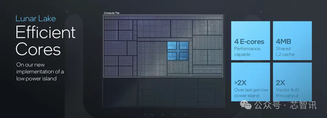 Lunar Lake的Skymont E-core效率核心是专为实现全新水平的性能效率而设计。4个E-core共享4MB L2缓存,能比上一代有着超过2倍的省电表现,并比上一代提升2倍的Vector与AI输出性能。