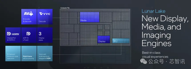 Lunar Lake内部还集成了与GPU搭配的全新显示、多媒体和图像引擎(IPU)。其中,显示核心拥有3个eDP 1.5、DP与HDMI 2.1输出接口,多媒体引擎支持AV1和最新的VVC编译功能,IPU则可提供Temporal noise reduction、Multi-frame与Dual exposure staggered HDR等图像强化功能。