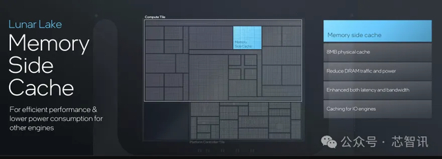 另外,Lunar Lake还在众多核心芯片中加入了共享的8MB Memory Side缓存,可以降低DRAM的传输次数并节省电源,借助缓存机制让核心与DRAM间的延迟进一步降低并提升传输带宽。