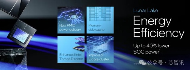 根据英特尔公布的数据显示,得益于先进的工艺节点、新的E-core设计、Memory Side缓存、供电设计、电源管理及线程调度器技术,Lunar Lake比起上一代的Meteor Lake 的能耗可降低40%。