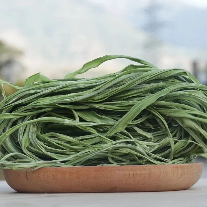 晒干以后的贡菜颜色翠绿的,都是细长条形的,看起来和新鲜的长豆角差不多。