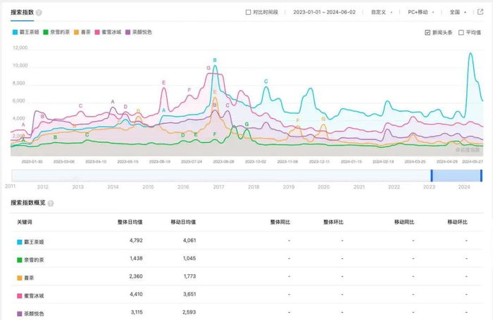 从下图百度指数可以看到,2023年以来,霸王茶姬的热度持续爬坡,去年8月出现波峰,去年10月至今,一直领先于奈雪的茶、蜜雪冰城、喜茶和茶颜悦色。