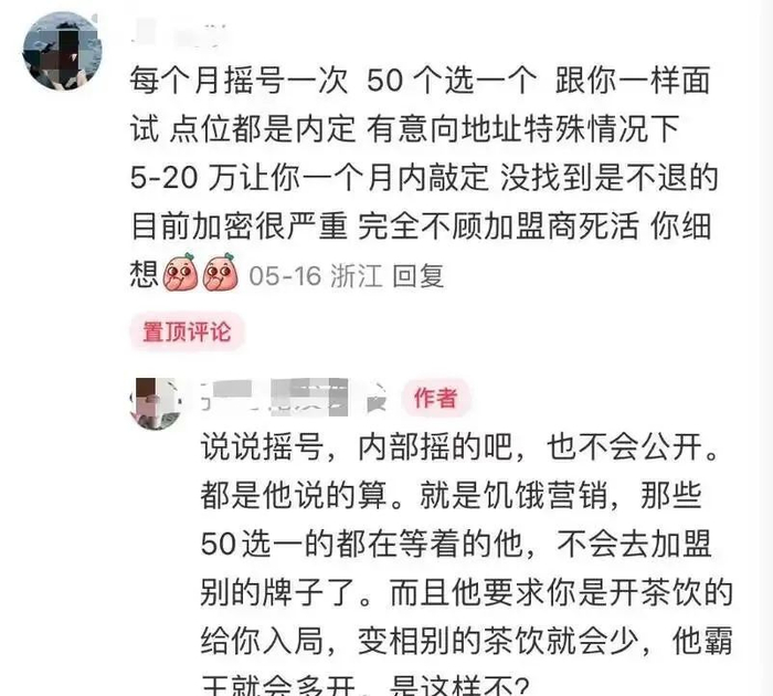 不少尝试过加盟的网友反映,如果没给茶水费选不到好点位。根据一位尝试过加盟霸王茶姬的网友所述,好点位额外给5-20万,一个月内要敲定下来,如果没法敲定费用不退。这位网友说的敲定是指拿到店面资源。