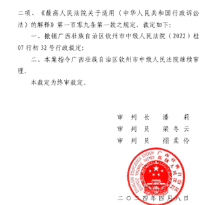 2024年4月8日,广西高院对该案作出行政裁定:撤销钦州中院裁定,指令钦州中院继续审理该案。