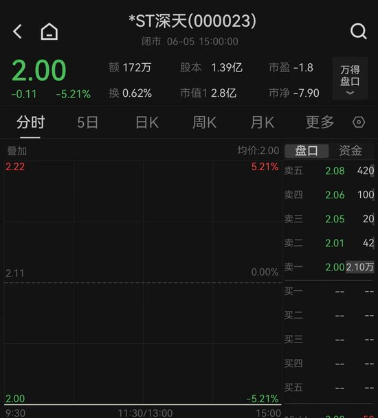 6月5日,*ST深天股价跌停,最新市值为2.8亿元,连续2个交易日低于3亿元。