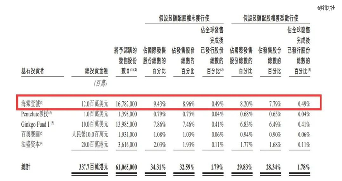 根据公告,8位基石投资人中,晶泰科技与海棠壹号的结识源于包销商。后者是一家注册在香港的私募股权基金,由海杉资管作为GP进行投资管理,主要聚焦于生物医药、人工智能、集成电路、新能源及新材料等战略性新兴产业的投资,管理规模超10亿港元。海杉则由上海国盛资本管理有限公司的一家全资附属公司及受控法团控股。