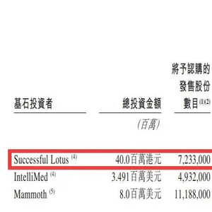 本次海棠壹号认购晶泰科技1200万美元,为第三大认购方;第 一大认购方为Successful Lotus,认购金额达4000万港元。创投日报记者注意到,Successful Lotus是一家注册在英属维尔京群岛的投资控股公司,由李家杰全资拥有,李家杰是李兆基之子,为香港地产大亨、四大家族之一。