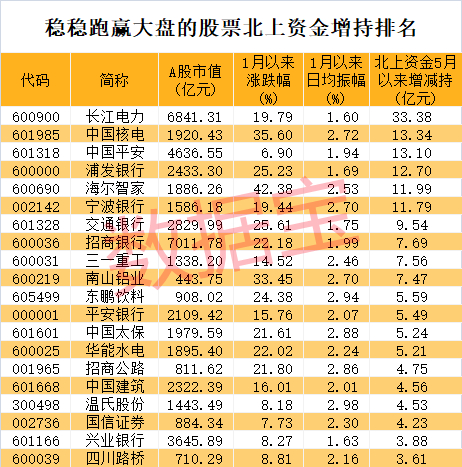 资金流向来看,按照区间成交均价计算,5月以来北上资金增持超1亿元的股票有47只,其中6股获净买入超10亿元,分别是长江电力、中国核电、中国平安、浦发银行、海尔智家、宁波银行。长江电力5月以来获北上资金增持金额33.38亿元,排在第一位。