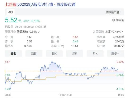 截至6月4日收盘,七匹狼报5.52元/股,最新市值38.92亿元。