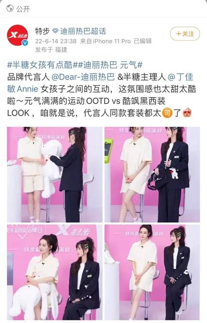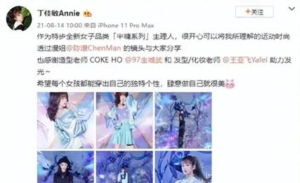 相比起新郎的低调,新娘丁佳敏仿佛高调很多,她不仅参与特步女子品类的调研和全程规划,还活跃于特步的各类活动中,甚至亲自上阵拍摄产品海报,为其代言。