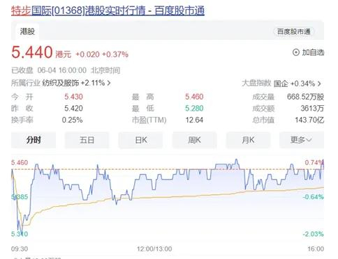 截至2024年6月4日收盘,特步国际报5.44港元/股,最新市值143.7亿港元(约133亿元)。