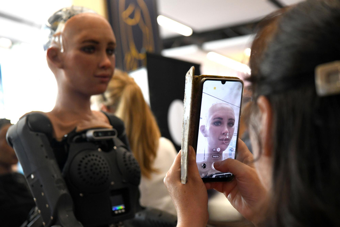 2023年7月7日,在瑞士日内瓦“人工智能造福人类全球峰会”上,一名参会者给仿真机器人索菲亚拍照。新华社记者连漪摄