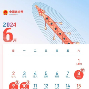2024年端午节放假安排为:6月8日(星期六)至6月10日(星期一)放假,共3天。