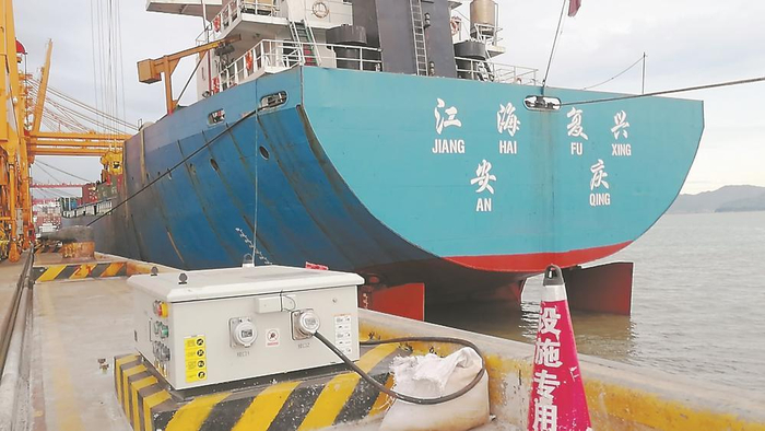 靠泊在厦门港的船舶连接上岸电。
