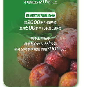 实现乡村全面振兴的关键在于产业发展。3.3平方公里的桃园村,因槜李而兴,从原先几十亩小打小闹,到现在2000亩规模种植;从原先只有几十户种植户,到现在全村500多户几乎全员参与;从原先人均收入几千元,到现在槜李上市旺季,每家每户收入达4万元,去年全村槜李销售额超3000万元。