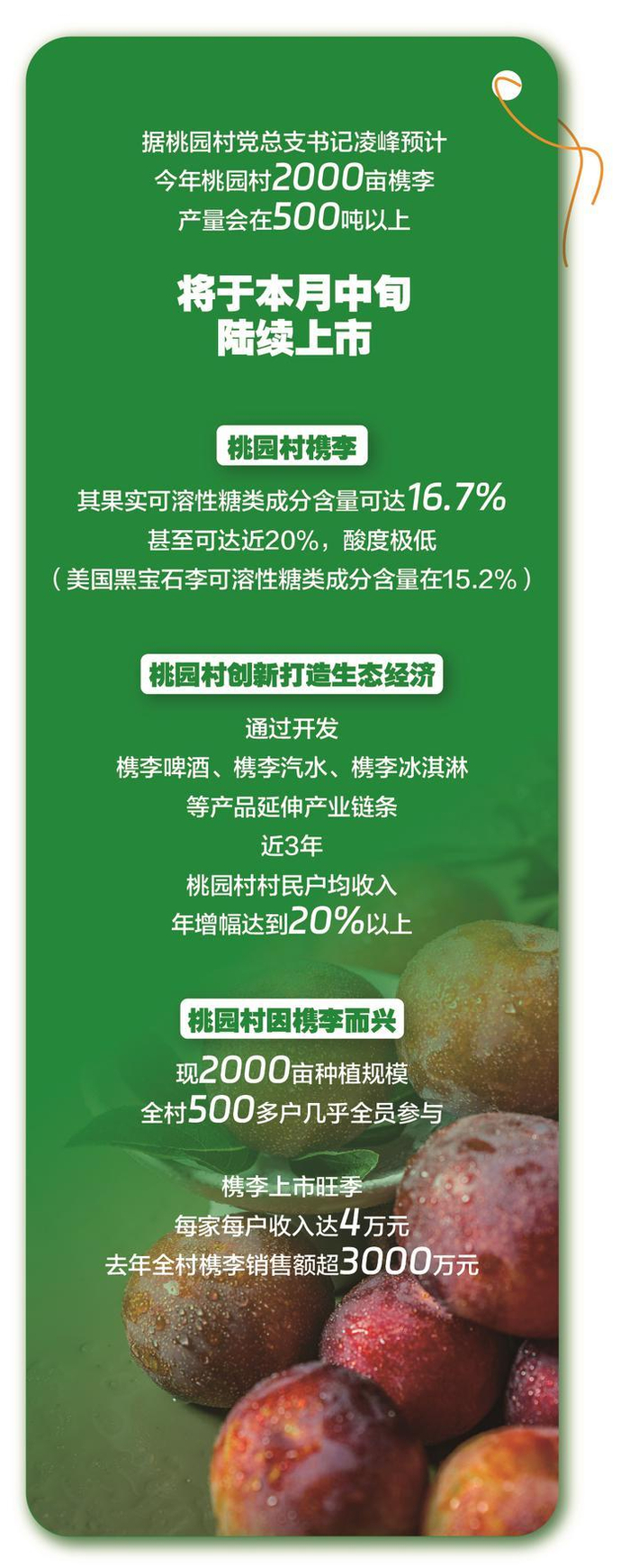 果形硕大,皮色紫红,芬芳浓郁,甘香鲜美……正如夏天的江南,饱满明丽,温润清甜。据桃园村党总支书记凌峰预计,今年桃园村2000亩槜李,产量会在500吨以上,将于本月中旬陆续上市。