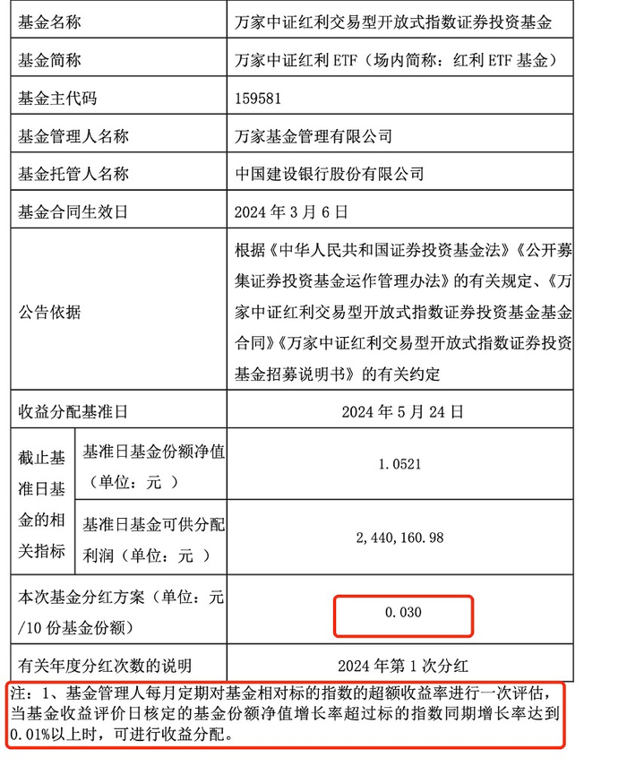 根据基金合同,万家每月定期对红利ETF基金的超额收益率进行一次评估,当超额收益率达到0.01%以上时可以进行收益分配。这意味着,如果市场行情有支撑,这只基金每年可以分红12次。