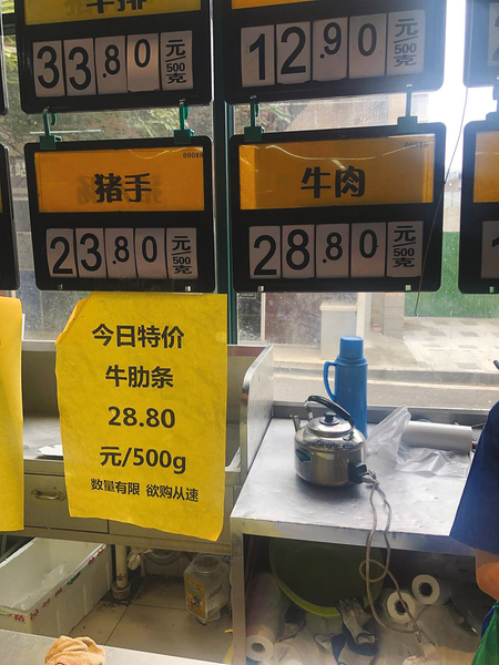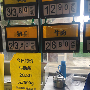 另一家摊位的商户则告诉记者,店内现在只剩下牛腩和牛肋条,价格都在25元左右一斤。他表示,他们销售的牛肉都是来自淮南的黄牛肉,每天能销售出四五头牛。商户还指出,去年同期牛肉价格都在35元左右一斤,今年价格明显下跌。