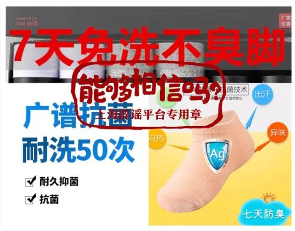 因号称具有“防臭”作用,抗菌袜在一众抗菌纺织品中独树一帜,销量很高。不少商家宣称自家袜子具有“广谱抗菌”功能,可实现“多日防臭”“出游免洗”。