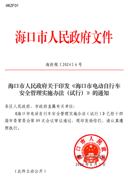 近年来,电动自行车保有量逐年急剧攀升,火灾风险也逐年增加,给人民群众的生命财产安全带来了威胁。为有效预防和遏制电动自行车火灾事故,海口市安委办、市消安委办在深入调研、广泛征求意见的基础上,联合制定了《海口市电动自行车安全管理实施办法(试行)》,并以海口市人民政府名义印发,将于2024年7月1日正式实施。