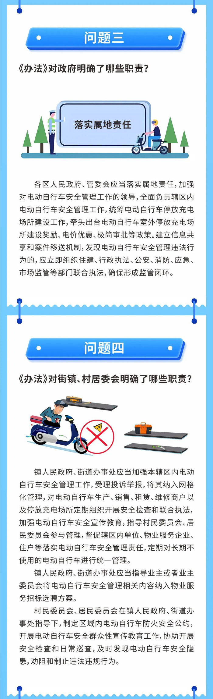 镇人民政府、街道办事处应当加强本辖区内电动自行车安全管理工作,受理投诉举报,将其纳入网格化管理,对电动自行车生产、销售、租赁、维修商户以及停放充电场所定期组织开展安全检查和联合执法,加强电动自行车安全宣传教育,指导村民委员会、居民委员会参与管理,督促辖区内单位、物业服务企业、住户等落实电动自行车安全管理责任,定期对长期不使用的电动自行车进行统一管理。