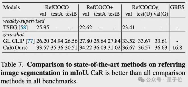 作者还测试了CaR在零样本Refering segmentation的效果,CaR也表现出了相较之前零样本的方法表现出更强的性能。