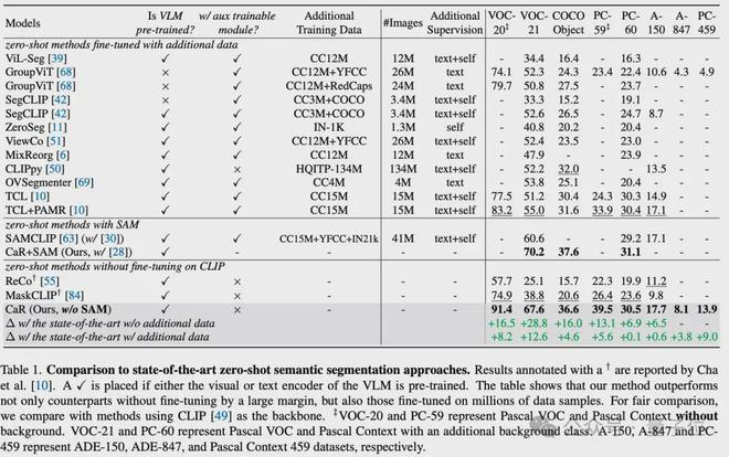 通过这些技术手段,CaR技术在多个标准数据集上实现了显著的性能提升,超越了传统的零样本学习方法,并在与进行了大量数据微调的模型相比时也展现出了竞争力。如下表所示,尽管完全无需额外训练及微调,CaR在零样本语义分割的8个不同指标上表现出比之前在额外数据上进行微调过的方法更强的性能。