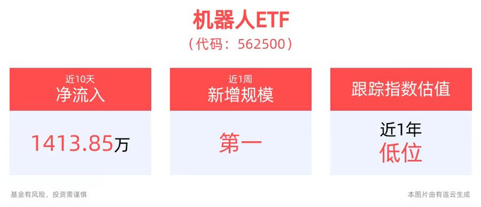 密集热点催化下,资金持续布局机器人板块。机器人ETF(562500)最新资金净流入1012.88万元,近5个交易日内,合计“吸金”超3500万元。规模方面,机器人ETF近1周规模增长超3500万元,新增规模位居可比基金1/5。