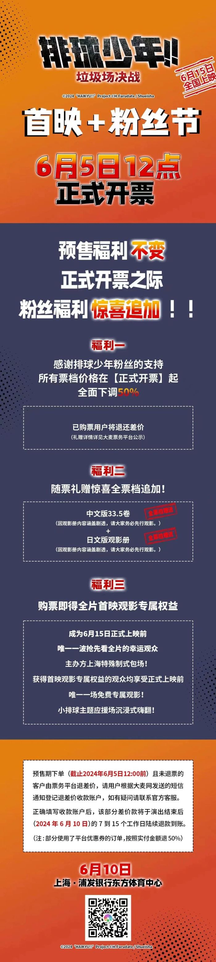 这尴尬的售票状况,和《排球少年!》在国内的热度显然是不匹配的。活动方不得不进行补救,不仅删除了官博上宣传限定礼包细节的微博,并在大麦网的销售页面宣布6月5日直接把全场票价打5折进行重新售卖(之前全价购票者退差价),把粉丝期望的活动流程细节写得清清楚楚,同时还加赠了33.5卷特典观影手册,以及活动当天的超前点映院线包场观看影片特权。