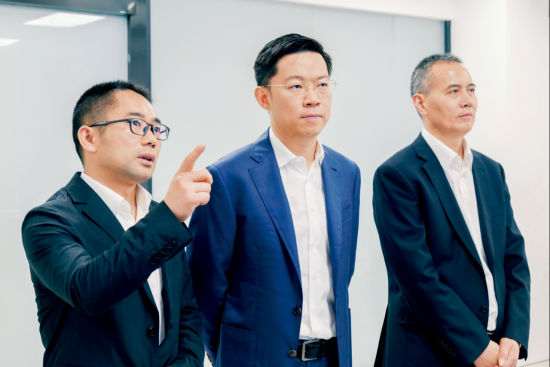 2024年5月,莫思铭(中)在永鼎光棒厂区听取负责人汇报工作。面临产业结构转型和宏观经济下行的双重压力,莫思铭针对产业、产品和组织能力制定了相关转型升级战略,加大科研投入,带领企业稳步由“制造”迈向“智造”。图/受访者提供