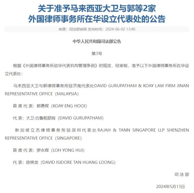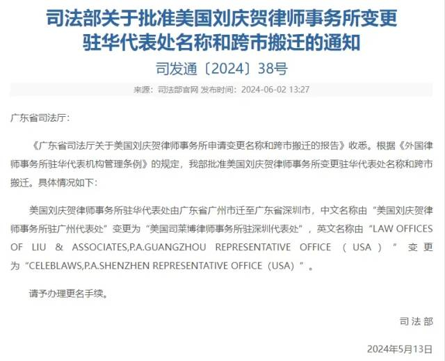 6月2日,司法部官网发布公告,根据《外国律师事务所驻华代表机构管理条例》规定,准予新加坡立杰律师事务所在深圳设立代表处,以及美国刘庆贺律师事务所驻华代表处由广东省广州市迁至深圳市,中文名称由“美国刘庆贺律师事务所驻广州代表处”变更为“美国司莱博律师事务所驻深圳代表处”,上述两家国际律所驻华代表机构均落户前海合作区。这也意味着,深圳7家外国律师事务所驻深圳代表处,有5家落户前海。