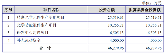 丹耀光学原拟在深交所创业板公开发行股份数量不超过1,981.65万股(不含采用超额配售选择权发行的股票数量),占发行后总股本的比例不低于25%,全部为新股发行,原股东不公开发售股份。公司原拟募集资金46,279.95万元,用于精密光学元件生产基地项目、光学功能组件生产项目、研发中心建设项目、补充流动资金。
