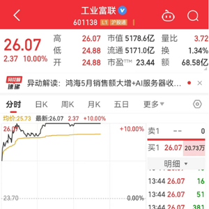 6月6日,A股算力产业链沸腾。工业富联今日上午大幅拉升,截至发稿,工业富联(601138.SH)涨停,报26.07元/股,成交金额68.58亿元,最新市值5178.6亿元。