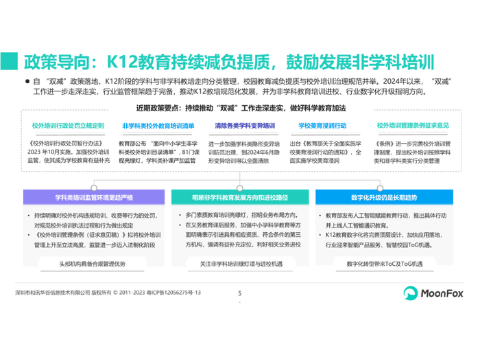 K12在线教育行业历经“停课不停学”的热潮、“双减”政策的规范,于2022年底遏制虚火,跨过阵痛期迎来回暖。政策鼓励非学科培训开展,使得素质教育市场的外部环境进一步改善;智慧教育布局叠加AIGC技术带来新增长曲线,行业迎新一轮发展机遇。