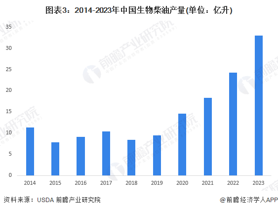 目前,我国生物柴油的生产以第一代生物柴油为主。受益于欧盟生物柴油需求增长,2018年以来,中国生物柴油产量不断增长,2023年产量达到33亿升,同比增长35.8%。