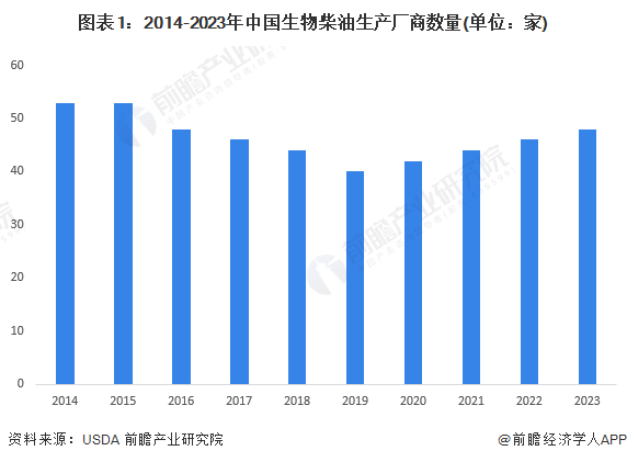 2014-2023年期间,中国生物柴油行业的生产企业呈现先下降后增长的趋势。根据USDA数据显示,截至2023年,中国共有生物柴油生产企业48家,较2022年增加了2家。