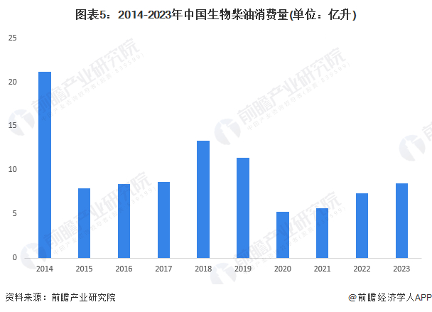目前,我国生物柴油仍处于试点阶段,原料以废油脂为主,上海是目前国内唯一实行生物柴油添加的地区,导致国内生物柴油市场的消费量较少。2023消费量为8.5亿升,同比增长15.3%。