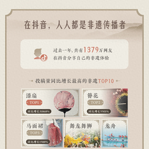 在抖音,越来越多人传承和传播非遗,“95后”“00后”成为生力军,30岁以下传承人年均增长72%;创作者们以特效视频、探访复刻等多种形式展示非遗,濒危、小众非遗因此被更多人看到;非遗视频和直播带动用户种草、打卡及消费,过去一年,共有1379万名网友在抖音分享非遗体验,其中漆扇打卡视频增速超318倍,购买非遗团购商品的用户数同比增长328%。
