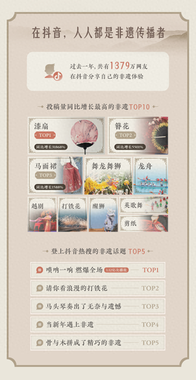 报告显示,过去一年,共有1379万名网友在抖音分享非遗体验。在投稿量同比增长最高的非遗前十位榜单中,漆扇位列第一,投稿增速超过318倍。作为蟳埔女习俗之一的簪花及马面裙位列第二、三位,有超过55倍和15倍的增长;另有舞龙舞狮、龙舟、越剧、打铁花、醒狮、英歌舞、剪纸等非遗项目上榜。
