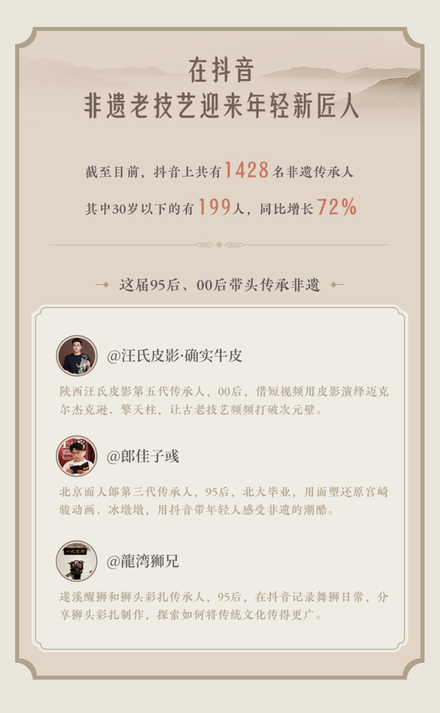 在抖音,非遗老技艺迎来了年轻新匠人。报告显示,截至目前,抖音上共有1428名非遗传承人,其中30岁以下的有199人,同比增长72%,互联网时代成长起来的“95后”“00后”,成为传承、传播非遗的生力军。