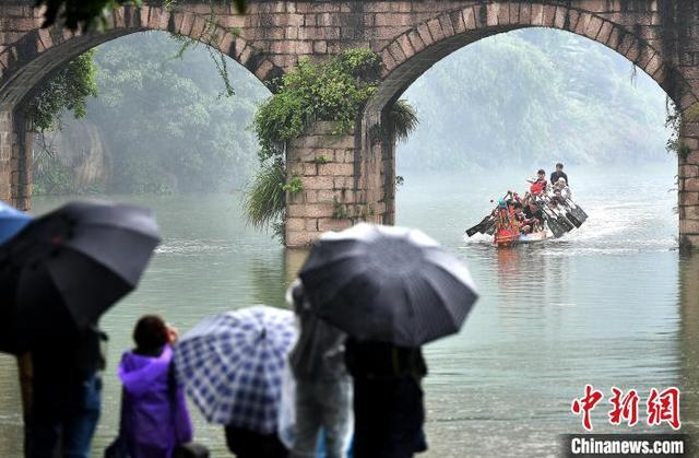 6月6日,福建省福州市长乐区江田镇村民们在水中划着刚入水的新龙舟。当日,福建著名侨乡长乐众多新造龙舟举行试水仪式,迎接端午节龙舟赛。张斌 摄