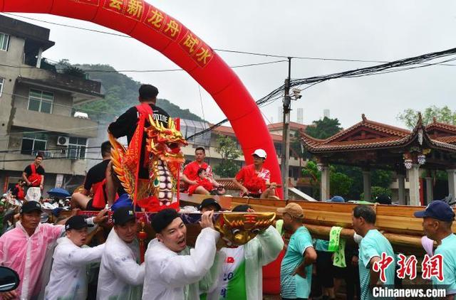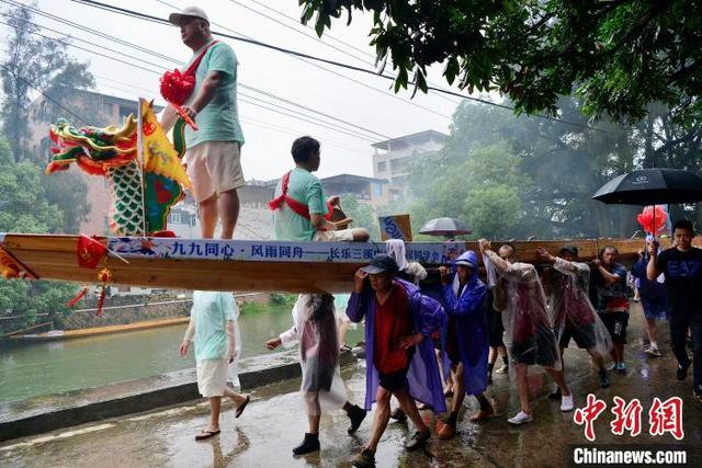 6月6日,福建省福州市长乐区江田镇村民肩扛着新龙舟前行。当日,福建著名侨乡长乐众多新造龙舟举行试水仪式,迎接端午节龙舟赛。张斌 摄