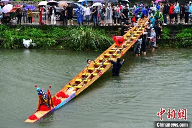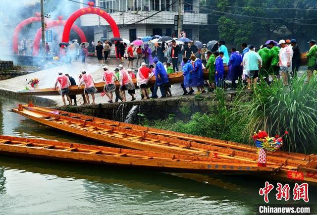 6月6日,福建省福州市长乐区江田镇村民们将新龙舟推入水中。当日,福建著名侨乡长乐众多新造龙舟举行试水仪式,迎接端午节龙舟赛。张斌 摄