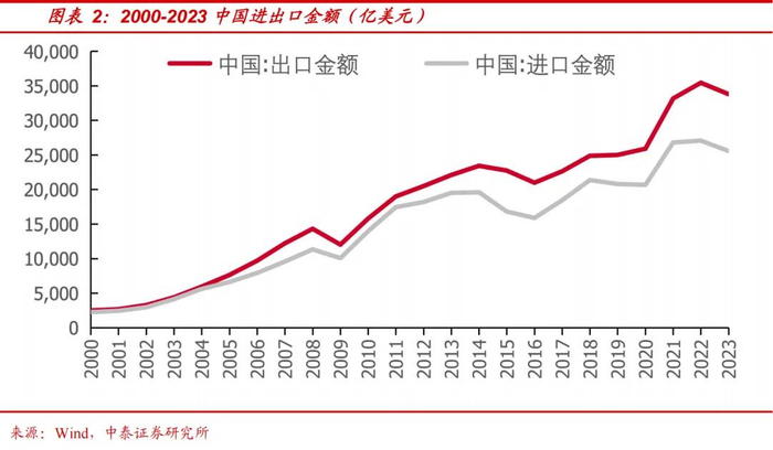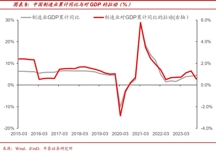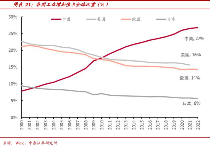 值得注意的是,中国的“重资产”则带来更强劲的制造,其表现在我国产业体系完备、产业配套齐全及产业协同高效。我国是世界上产业体系最完备的国家,拥有全球规模最大、门类最齐全的生产制造体系,在500种主要工业产品中,有四成以上产品产量位居全球第一。2023年制造业增加值达33万亿元,占世界的比重稳定在30%左右,我国制造业增加值连续多年稳居世界第一,且增加值与占比均处于上升趋势。