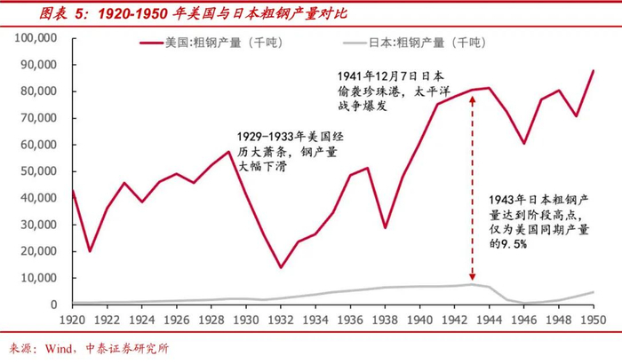 国家安全需要工业、军事、制造业的保障。美国霸权的建立和维持依赖的也正是强大的工业和军事实力。1941年日本海军偷袭珍珠港,美国正式加入二战,依托其强大的军备生产力,丰富的工业基础和资源,能够快速地转换到战时生产模式,大规模生产军舰、飞机等军用装备。美国迅速动员其工业和军事力量,修复了受损的舰队,并建造了大量新的军事装备,成为改变二战胶着局面的重要力量之一。