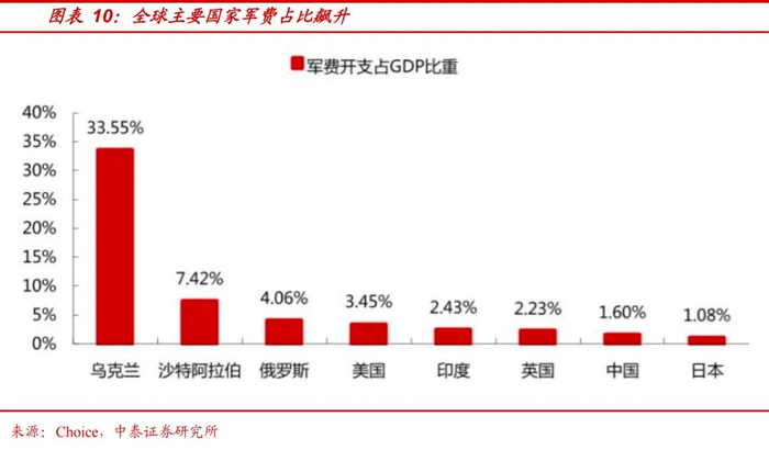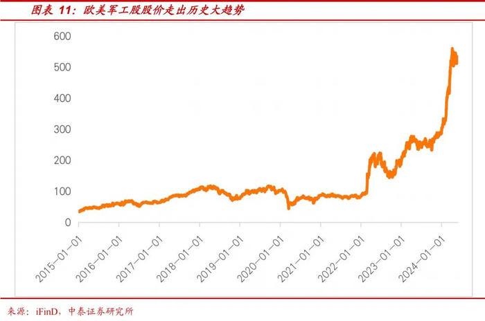 “安全主导下的经济韧性”逐步成为全球发展共识的更有力的证据之一是:世界主要国家军费开支提升明显。背后在于全球加速进入制造业重塑及扩张,加强国家战备能力和供应链安全,制造业是军工进一步发展的基础。从军工投入来看,过去几年,各个国家军费均有所提高,军费占GDP的比重也有所上升,欧美军工企业股价涨幅十分明显。例如,德国的军工股莱茵金属股价从2015年初的36.27欧元涨到了2024年5月31日的527.8欧元,股价增长了14.55倍,15年-23年间年均涨幅25.84%。