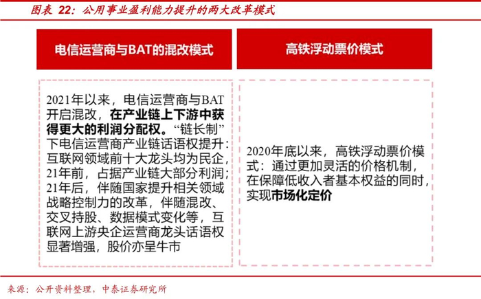 2020年底以来,高铁浮动票价模式,通过更加灵活的价格机制,在保障低收入者基本权益的同时,实现市场化定价。2021年,国家发改委发布《关于进一步深化燃煤发电上网电价市场化改革的通知》,推动形成市场电价,放宽电价浮动范围。2024年1月31日,《基础设施和公用事业特许经营管理办法》通过,推动公用事业适度转向市场化定价,降低特许经营企业对财政补贴的依赖度。