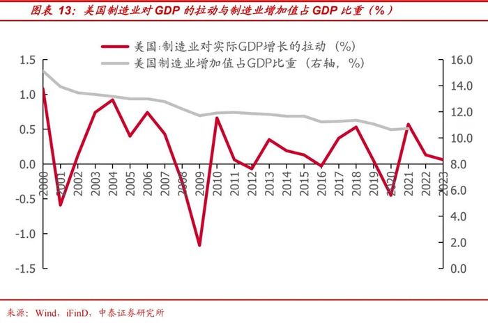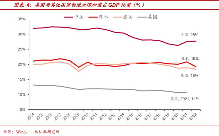 以美国为例,美国过去几十年的全球化进程本质上是为了迎合华尔街资本对于利润的追求。资本家更加青睐于轻资产、高利润,具有更高附加价值的企业,这一倾向使得美国企业为了降低成本和寻求更广阔的市场,将制造业转移到劳动力成本较低的国家,如中国、墨西哥等。本土仅保留核心的设计、研发部分,这种企业行为无疑加剧了制造业的逐步外移,欧美本土制造业的生产“实力”逐步下降。
