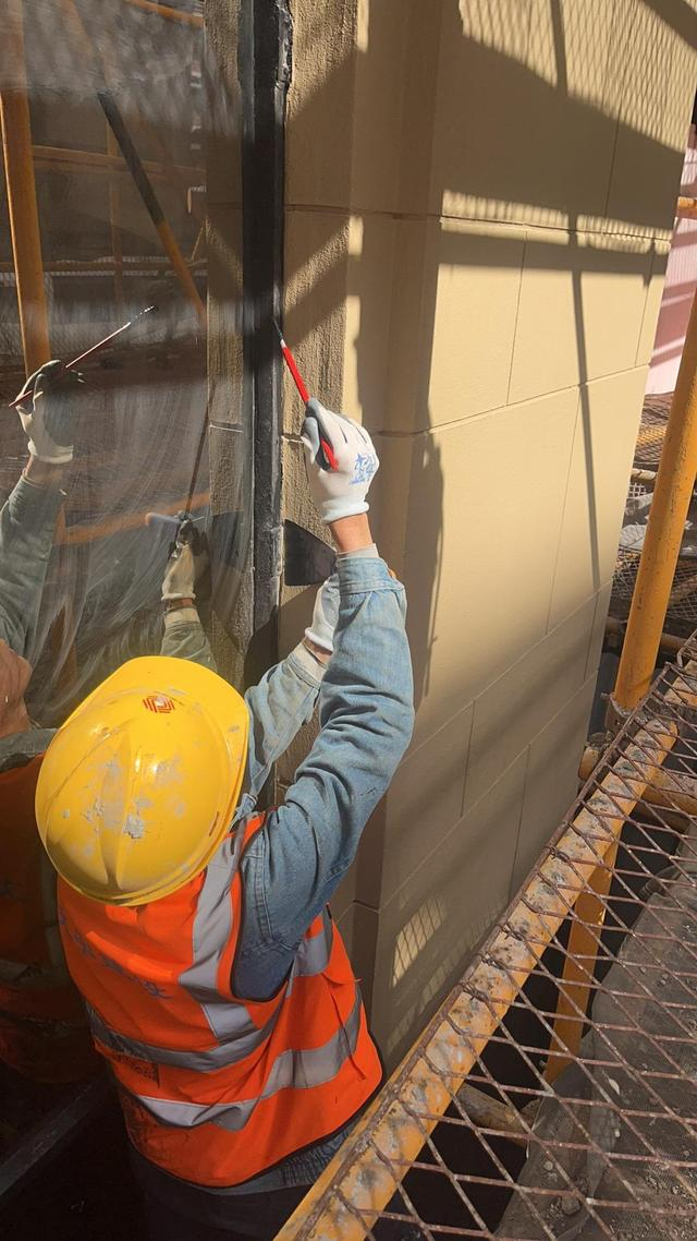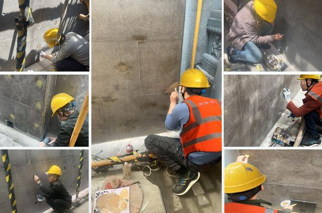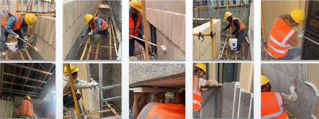就拿外立面裙房后期加建的石材与装饰来说,此次修缮中,为了恢复历史原貌,予以了拆除,并对墙体基础进行检修,钢筋部分进行防锈处理,采用专用聚合物水泥砂浆对缺损部位进行修补、裂缝。 此外,施工人员还在拆除勒脚部分后,发现有保存完好的原有金山石勒脚,但遗留很多钢钉及孔洞,现场将孔洞进行清洗、填补、修复。根据历史资料,施工人员恢复了原有的建筑装饰造型,新做斩假石工艺。历史资料中入口处的金山石造型,也新做了钢架基础。