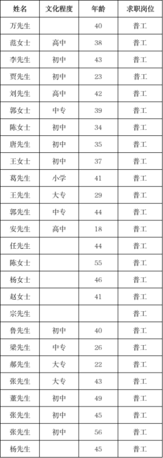 1.电焊工:年龄20~45岁,男性,会二氧化碳气体保护焊,包括手焊、自动焊以及机器人焊接;熟练工优先,有两年工作经验,无相关经验者可学徒。
